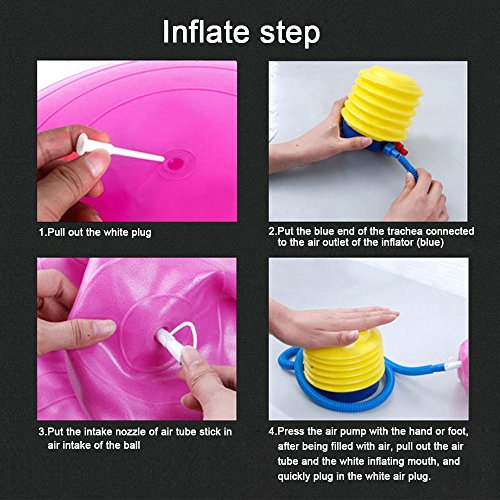 PROFESSIONAL GRADE Fitness Ball includes a Pump, Plug, and Plug Remover Tool- Highest Quality PVC Material. ANTI-BURST TESTED at 2000lbs able to stand up to the most rigorous workout conditions. This ball will not burst if punctured, it will slowly deflate. More colors and more sizes are available for you. This ball is very versatile. You can use it as part of your Yoga, Pilates. By using our ball you will be helping your body feel and perform better. 1. Your exercise fitness ball in everyday life Our balls are used in many areas of sport and daily life. The balls afford an important role in the treatment of back problems and the gentle muscle building in the area of physiotherapy. A targeted workout with a gymnastics ball replaces the visit to the gym in many cases. 2. The main focus of the training with gymnastics balls is in the body core. This mainly consists of the deep abdominal, back and pelvic floor muscles. In the "wiggle" on the ball, a whole-body training takes place, which stresses its entire musculature and at the same time spares its joints. User tips: - Store your ball indoors at room temperature - The fitness ball is easy to clean with just a soft damp cloth - Keep away from sharp objects Note: Package includes: Exercise Ball/Foot-Pump/Plug/Plug Remover Tool. SUPERIOR DURABILITY- 2000 Micro Meters Thick- Strong enough to use as a daily Exercise Ball Office Chair and a Fitness Ball for Children, Women and Men: Sizes come in 55cm, 65cm, 75cm.