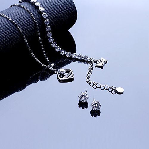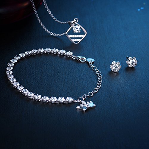 ABOUT AKIMOTO: Love chic and color. As a good JEWELRY designer and seller, we keep the style, technology, material, price and customer service as a top priority, hope you have a nice shopping experiences at our store. If you have any question about our products or service, kindly please contact us at any time, we will try our best to help you. ABOUT SILVER JEWELRY SETS: Brand name: AKIMOTO Color: Clear Identifier: S925 Matal: Sterling silver Stone: Cubic Zirconia Weight: Stud earrings:1.53g; Bracelet: 4.4g; Necklace: 3.45g Size: Stud Earrings(L * W): 1.4cm * 7mm; Bracelet:12.6cm + 5.5cm extension chain; Necklace Lenght: 45.4cmCome in an elegant jewelry gift box, perfect gift to your mom, wife, daughter or your girlfriend on Mother's Day, Wedding Anniversary, Birthday, Valentine's Day, Christmas or other important festivals. WARM TIPS: 1.Please avoid contacting with the acid and alkali, corrosive substances. 2.Please avoid the collision, so as to avoid surface scratches. 3.Please avoid wearing it when sweating a lot, shower or sleep, etc. 4.Please wipe them with soft cloth when you clean your jewelries. SILVER MAINTENANCE: 1.To maintain silver dry, do not wear swimming, not close to the hot springs and sea water, cosmetics, etc., when not use the best methods is use a bag sealed to prevent the silver surface in contact with air oxidized black. 2.For routine cleaning squeeze a little toothpaste on silver top, add a little water, rub to play the appropriate small amount of bubbles, and then gently wipe the inside and outside a small brush, then rinse with water is ok. NOTE: Due to various types of computers and monitors, the actual color of the jewelry may be a little different from the picture.