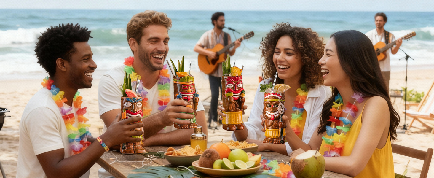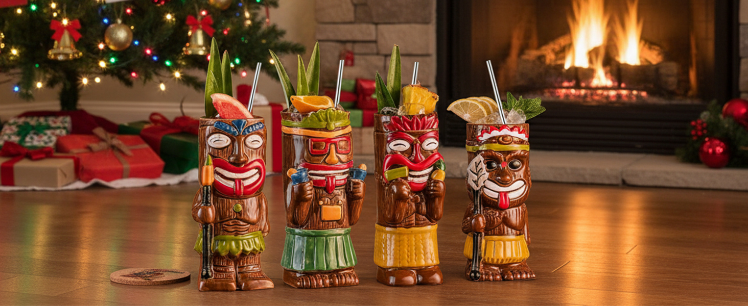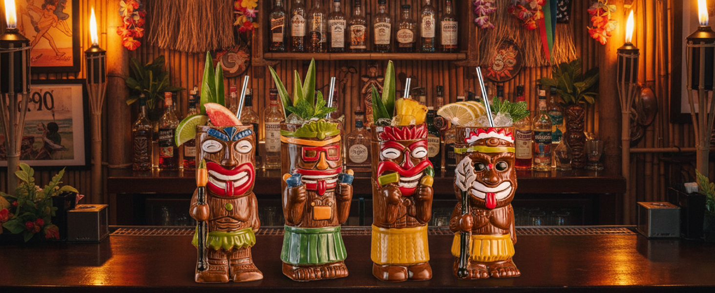 The SUN GKOTTA Cocktail Tiki Mugs Set includes 4 glossy ceramic mugs, each paired with a coaster and straw, designed for tropical cocktails like Mai Tai and Pina Colada. Crafted with thick, vintage-style ceramic and a balanced base to prevent spills, this BPA-free set is perfect for parties, gifting, or adding an exotic flair to your drinkware collection.