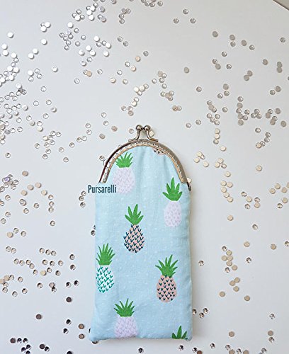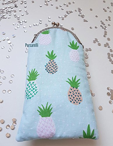 Glasses case with funky pineapple print on a green fabric background. With a round silver style kiss lock clasp, fully lined and padded for extra coziness, and with ribbon detail inside, the frame is hand stitched to the purse for extra durability and strength. Made from cotton and a clasp, the measurements are: Width 9 cm, height 19cm (3.5 x 7.5 inches). All items by Pursarelli are handmade in the UK, in a smoke free, pet free environment. What you see is what you receive, we never put a generic photograph on and state pattern may vary.