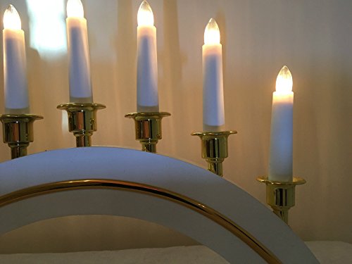 44cm X 30cm Static Indoor White Wood Gold Cupped and Gold Rim Candle Arch with 7 Clear Bulbs White Cable 1 Replacement Clear Bulb included. with on off switch Fitted with 3 pin UK plug Voltage 220-240V IP20 power cord 150cm