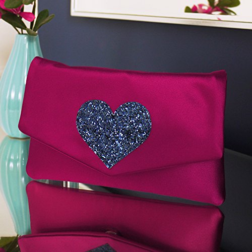 A luxurious satin clutch glamourously finished off with a glittery heart detail! Clutch outer: Duchess satin Heart detail: Fabric backed chunky glitter Lining: Stripy cotton (black/white or navy/white depending on the outer colour) ----- This clutch is small in size (the perfect holding size) but still big enough to hold the essentials (for example: phone, lip gloss, cash, key). Height: 11cm Length: 19cm