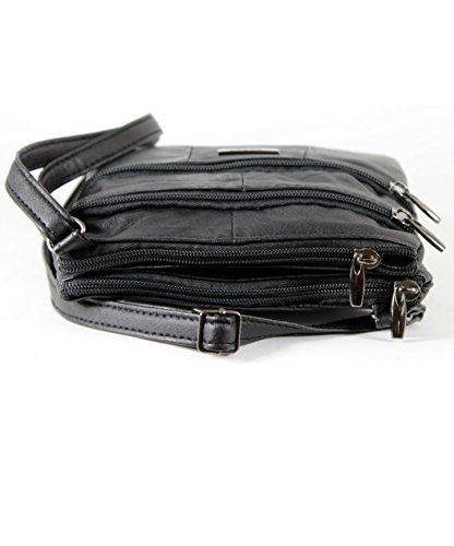 Small Real Genuine Soft Leather Cross Body / Shoulder Bag for Womens / Girls Black Color by Shancharan Real Leather Cross body Bag 4 Compartments with Zip Fully adjustable strap It is 18.4cm wide 17.3cm high Soft cowhide leather Patch shoulder bag 2 zipped pockets on front, 2 large zipped openings on the top Fully adjustable shoulder strap Measurements: 17cm tall x 17cm wide x 2cm
