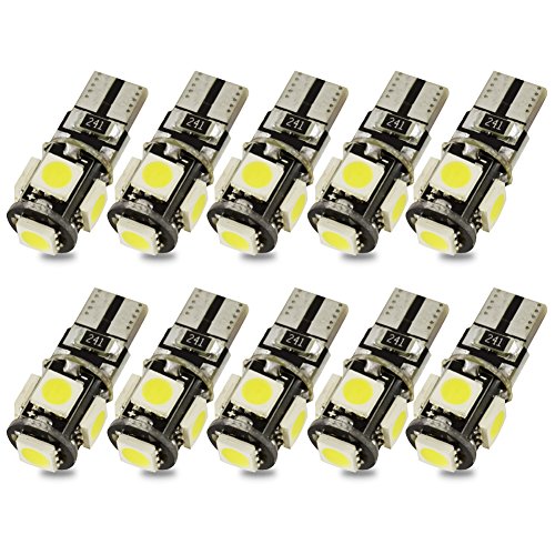 T10 LED Specifications: ◆ Voltage: DC12V ◆ LED number: 5 LEDs ◆ LED color: White ◆ Bulb type: T10 Wedge (W5W) ◆ LED Type: 5 SMD 5050 ◆ Power: 1.5W ◆ Lifespan: 50000h T10 LED Features: ◆ Faster on/off response time. ◆ Easy to Instal, Simple to fit, Just plug in and play. ◆ High brightness, Low heat dissipation, Long life. ◆ Protect the eye-sight, no strobe, no radiate, no light pollution. ◆ Energy saving. Low heating level, low power consumption and long life span up to 50,000 hours. ◆ Good heat dissipation, High Temperature Resistance,Rust Resistance,Bump Resistance, vivid color. Applications: Car/ Auto/ Vehicle LED interior bulbs, Dash / Dashboard (gauge cluster light), Instrument lights, Clearance lamp, Side maker lamps (corner light), Tail light (rear light bulb), Stop light, Parking lights, Position lamp bulbs, License plate lights(number plate light), Reading lights, Turn signal light lamps, Indicator light, Map lights, Panel lamp, Courtesy light, Trunk lights wedge bulbs, etc. T10 - Cross Reference: T10 W5W 194 168 501, 147, 152, 158, 159, 161, 184, 192, 193, 259, 280, 285, 447, 644, 555, 558, 585, 655, 656, 657, 901, 904, 906, 908, 909, 912, 914, 915, 916, 917, 918, 920, 921, 922, 923, 926, 927, 928, 939, 1250, 1251, 1252, 2450, 2652, 2825, 2921, 2951, etc. 【Note】 ◆ Make sure your bulbs T10 are with wedge before buying. ◆ Since LED lamp has + and - terminals, so if there is no lighting after inserting it into socket, just simply change the terminal oppositely. ◆ The article can only be used in a car 12V (less than 14V DC, can usually work differently, it is easy to burn the bulbs). The package includes: 10 x T10 LED