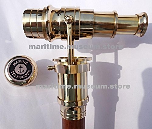 38 inch Nautical Walking Stick with Solid Brass Telescope. This solid rosewood Walking Stick Telescope is 38 inch long and is brand new. The manufacturer is Authentic Models (please see below). This gentle mans cane is hand crafted of solid rosewood in 3 piece construction (does not break down). The hidden telescope is made of solid brass and has a magnification of 3 X when fully extended. The tip of the hiking stick is rubber for added traction. The walking stick's polished knob fits comfortable in the palm of one's hand. Rosewood of the finest selection is used for a slender, but eminently sturdy stick. A cleverly engineered mechanism allows the telescope to be pulled up and swiveled. Held up by the stick it can be aimed, locked and pointed like a monocle. Do not forget to remove the cap. Size: 38" Length with Brass Knob x 2" Dia Brass Knob Size: 12cm - Length x 4cm Dia (Telescope) Material: Solid brass & rosewood