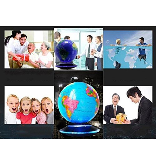Installation Steps:1. Please place the levitation device on a absolutely horizontal surface.2. Hold the globe with two hands and place it at 10cm above the center of the base, vertical down, move down at the same time, and pay attention to keep the globe horizontally.3. When the globe drops to about 2cm above the center of the base, if you feel the strong magnetic field to push the globe up or the globe is shifted in a direction, please move it in the opposite direction by hand horizontally.4. Until you feel that it is no longer offset, the globe has found the center point at this moment, you can completely release the hands. This position is the levitation place which is 12mm-15mm over the base.5. If you fail for the first time, please do not give up. Try it again.Warm Tips:1. Don't unplug the power adapter without remove the globe first, or the globe will pound the base.2. Powerful magnet! Please keep this item at least 20cm away from computer devices and other electronic devices and metal.3. When the globe rotates too fast or appears a beating phenomenon, please reposition the globe. Otherwise, the base overheat, and the device will produce over-current protection, automatic power off. Over heat will shorten the service life.Specifications:Product Material: ABSProduct Size: Ball diameter 8inchProduct gross weight: 1.5kgVoltage input: 100V-240V, 50 / 60HZPower output: 12v /1.25A