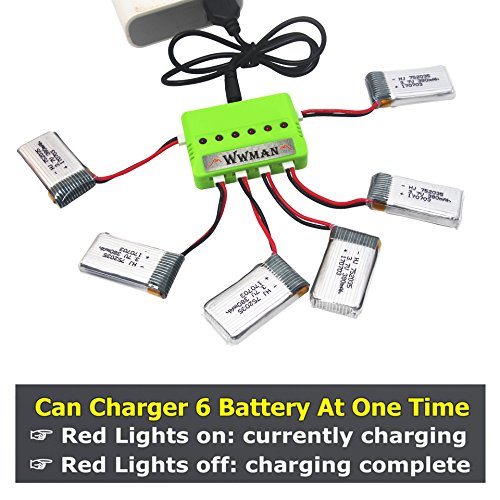 Wwman 6-Port Intelligent Charger for 3.7V Lithium RC Batteries: • Advance individual charging method - charges each cell individually • Overcharge protection • Short-circuit protection • Light weight and super easy to use. Specifications: • Voltage input: DC 5.0V Current Input:0.45-2-2.5A • Voltage output: 3.7v 450mAh-500mAh • Battery Type: Lithium • Size: 49 x 35 x 13mm • Weight: 12g (not including wires and package) • Includes: , • Compatible with most Micro RC Helicopter & Airplane 1S Batteries:TOZO Q2020 i Drone I4S YIZHAN and more. LED Status: • Red Lights on: currently charging • Red Lights off: charging complete 6Pcs 3.7V 380mAh Lipo Batteries for TOZO Q2020 i Drone I4S YIZHAN RC Quad Copters: It will give more PUNCH and ROBUST performance due to its higher current output and power. Direct replacement battery for TOZO Q2020 i Drone I4S YIZHAN, no modification is needed. Battery Features and Benefits: • Capacity: 650mAh • Voltage: 3.7V • Single Battery Weight: 10.5g / 0.37oz. • Single Battery Size: 37 x 20 x 7.7mm / 1.45 x 0.79 x 0.30 inch. Retail package includes: • 6 x 3.7V 380mAh LiPO rechargeable battery Direct replacement, no modification needed! • 1 x 6-Port Charger • 1 x Instructions Compatible with these Contixo models: • TOZO Q2020 • i Drone I4S YIZHAN ♥♥If you have any problem with our products,please contact us by email or ask the question on the product page.We will try our best to solve your problem!♥♥