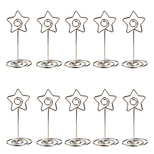 Description The memo holder is a decorative and functional item to keep your memos, phone messages all together. You can place the memo holder on table in your restaurant, use it to give instructions at reception, or hold a photo in any place that isn't large enough for a picture frame. Features - Color: Silver. - Material: Stainless steel. - Height: Approx. 8.5cm. - Width: Approx. 3.2cm. - Good-looking desktop document holder with base. - The clip is attached to a flexible rope wire cable. - Great for writing down unexpected office tasks. - Perfect for home or office with limited space. Package Including 10* Star Shape Place Card Photo Stand Holder Pictures Holder Note Clips Wedding Party Favor