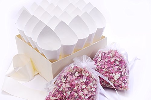 25 CONES WITH REAL NATURAL PETAL WEDDING CONFETTI - 100% BIODEGRADABLE- 25 cones with a box to stand them in and 2.5 litres of confetti to fill your cones. The confetti will come in 2 organza bags. Each organza bag measures approximately 22.5cm x 17cm when empty/flat. PLEASE MEASURE YOUR PETALS LOOSE OUT OF THE BAG, AS THE BAG COMPRESSES THEM SLIGHTLY TO PROTECT THEM, THEY WILL FLUFF UP CONSIDERABLY WHEN LOOSE. ALL OF OUR PETALS ARE 100% NATURAL AND BIODEGRADABLE WITH NO DYE OR COLOUR ADDED, GROWN HERE IN GREAT BRITAIN! Our confetti is a mix of pretty delphiniums, cornflowers & calendula petals, which float gently to the ground, perfect for wedding photos! PLEASE NOTE THE COLOURS MAY VARY SLIGHTLY FROM THE PHOTOS, AS ALL OUR PETALS ARE NATURAL AND SUSCEPTIBLE TO VARIATIONS HOW MUCH SHOULD I BUY? As a guide we say you should order enough for at least half your guests, however it is down to personal preference on how many guests you'd like to throw. Each cone contains one handful of confetti HOW LONG WILL THEY LAST? Our petals will keep for up to a year, just store them in a cool, dry place away from light, such as a cupboard or in a spare room. DELIVERY INFORMATION Orders are dispatched the same working day (Monday-Friday), if ordered before 11am.