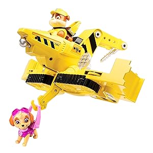 The Paw Patrol 6044472 Mission Paw Flip & Fly Vehicle Rubble is a 2-in-1 transforming toy that switches from bulldozer to jet, featuring built-in disc and wrecking ball launchers plus a rescue hook for airlifting pups. Designed for kids 3+, it encourages imaginative play and teamwork without the need for batteries or assembly.