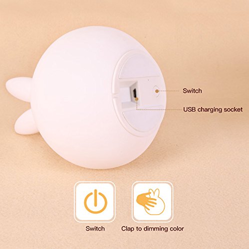 Functions: Dual Light Modes: Warm White Light and 6-Color Flashing Modes. Sensitive Tap Light Control. Lovely Rabbit Face Made by BPA-free Washable Soft Silicone. Warm Soft Light Offers Tender Guardian. 12-Hour Portable Usage Supports All-Night Companion Handheld Size and Standing Design for Flexible Placement Fabulous Gift Idea Especially for Babies, Kids, Girls and Ladies. How to Use 1. Charge the night lamp fully thru the packed USB cable before usage; 2. Press the main power button on the bottom to turn it on and the lamp will stay at normal warm white light mode; 3. Tap the silicone surface to switch to automatic 7-color breathing mode, standby mode and then back to normal white light mode successively; 4. If you want to turn off the lamp, please press the main power button again. Data Material: BPA-free Silicone+ABS Power: 1W Color: Warm White +colorful Input: 5V/400mA Battery: 350 mAH Lithium Charge Port: Micro USB Portable Usage: 15 hours in normal white light mode; 12 hours in colorful breathing mode Work Life: 50000 hours Packing listing Rabitt Night Lamp x 1 2.7ft USB Cable x 1(POWER ADAPTER NOT INCLUDED) User Guide x 1 Warranty 30 Days Money Back, 1-Year Warranty.