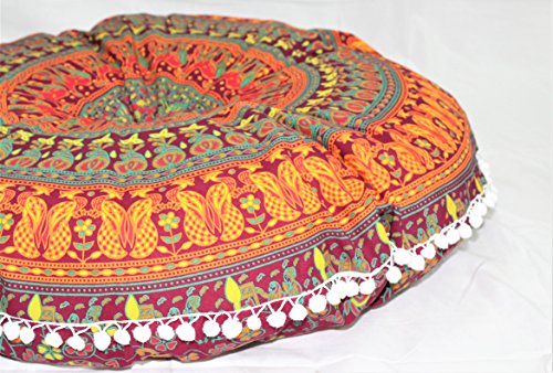This beautiful screen printed floor pillow is the perfect way to add extra seating that's fun and funky. Handmade by artisans in Sanganer, this bohemian style floor pillow is made from the mandala and medallion inspired tapestries that we also carry. You will receive this product unfilled, for easier shipping. You can easily fill it with fabric scraps or any filler material of your choice. Toss a few pieces around to add more seating to any space, from the formal living quarters to your entertainment room. Size 32 in. (80 cm) diameter Material 100% Cotton Weight 0.200 Kg ( 8.81 Ounce ) Place of Origin Sanganer - India Care Hand wash separately recommended; don't soak, or machine wash on cool; gentle cycle; tumble dry Note Cover only; insert not included How to Fill Easily fill from bottom opening with polyfiber or polystyrene (used in bean bags), cotton, scraps of fabric; or pillow inserts can be bought online.