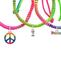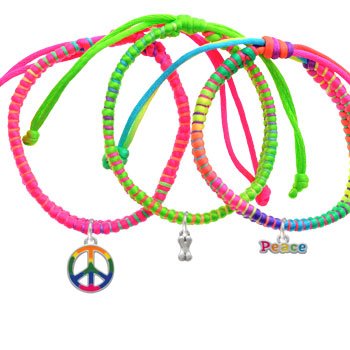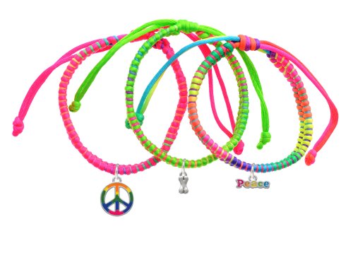 Silver Plated Mini Silver 3-D Dog Bone Neon Peace Macramé Friendship Bracelets (Set of 3). Silver-plated hand enameled charms. Charm size is approx. 0.42 x 0.17 x 0.07 inches (HxWxD) including loop. Three Satin-finish Macramé knotted adjustable bracelets: 6.5 to 9 inches. 1 - Hot Pink, 1 - Multicolored, 1 - Lime Green - Wear Stacked or Give to Friends. Hand enameled Tie-dye Peace Sign and Bubble Letter Peace Word Charms.