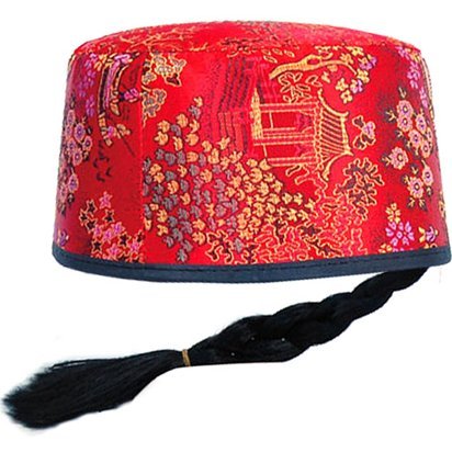 • Celebrate Chinese New Year • Oriental hat with faux plait • Measures 10cm high • One size fits most adults & teens Give your fancy dress outfit an Oriental twist with this eye-catching red hat. It has a pretty floral pattern featuring delicate pink blossoms. Attached to the back is a long black plait to finish off your look.