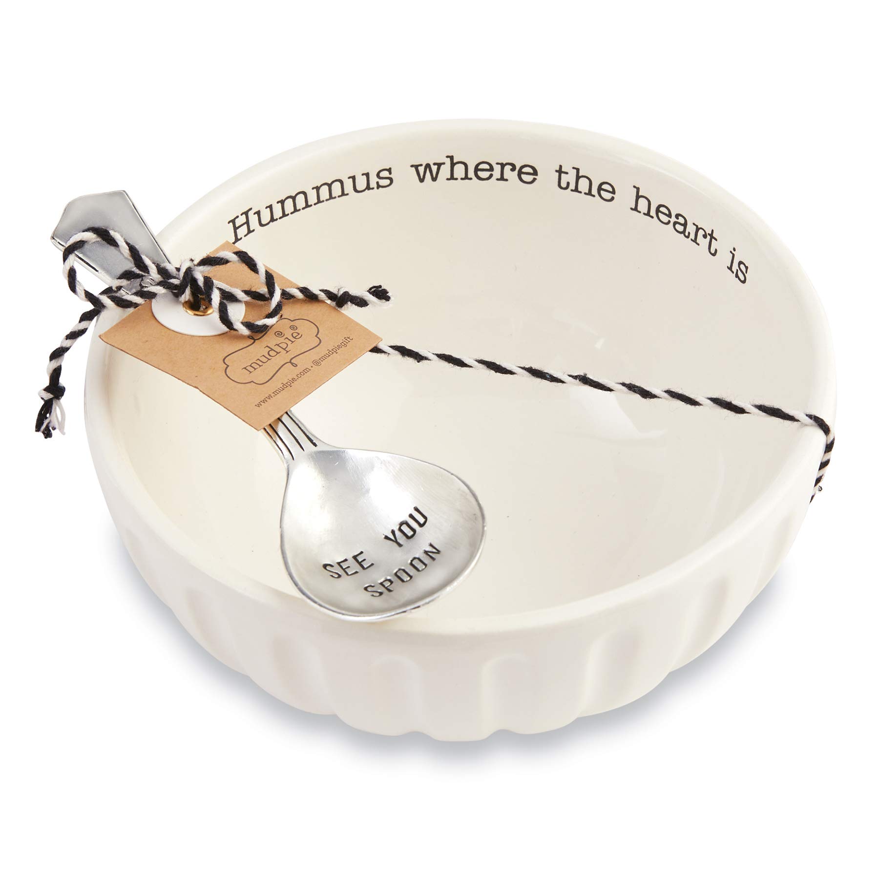 The Mud Pie Hummus Bowl with Spoon is a stylish 2-piece dolomite set designed specifically for serving hummus. Measuring 3" high and 6" in diameter, it features a fluted exterior and a charming 'Hummus where the heart is' sentiment on the inner rim. The set includes a 6" silverplate spoon stamped with 'See you spoon' and is both microwave and dishwasher safe, combining durability with playful design. Perfect for gifting or enhancing your kitchen table.