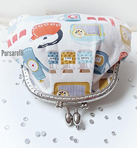 Big purse/make up bag/clutch in retro kitchen utensil print fabric with a cream background, and round silver style ornate kiss lock clasp. Fully lined and with ribbon detail inside, the frame is hand stitched to the purse for extra durability and strength. With slightly expanding sides, this size purse can hold change, lipsticks, keys, mints, credit cards, debit cards, tissues and more...all at once! Fill them with anything you need, use them for shopping, work, evenings out, holidays, they truly are small and mighty! Made from cotton and a clasp, the measurements are: Width 16 cm, height 15 cm (6.5 x 6 inches). All items by Pursarelli are handmade in the UK, in a smoke free, pet free environment. What you see is what you receive, we never put a generic photograph on and state pattern may vary.