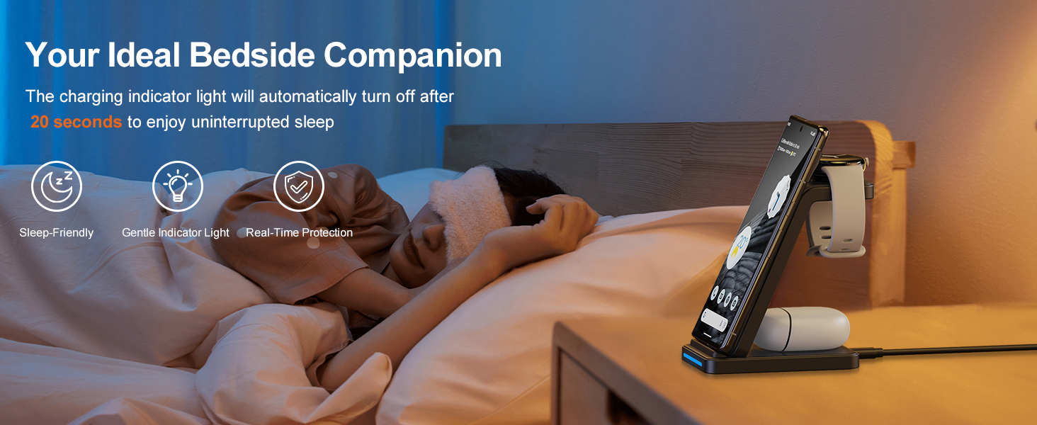 The media could not be loaded. The wireless charger completely meets my expectations: I wanted a small stand that I could place on my desk, easily place my phone on top of or pick it up. I love the design because it makes charging easy, works well, and avoids dealing with multiple cables , very convenient and efficient!!!Simply place my watch, phone, and headphones in the right charging positions, and they'll be good to go by the next morning.Most importantly, it seems very effective and indeed charges my phone faster than my old charger.The wireless charger is very user-friendly with three indicator light modes that let you know which device is being charged, and they automatically turn off after 20 seconds , perfect for bedside use.