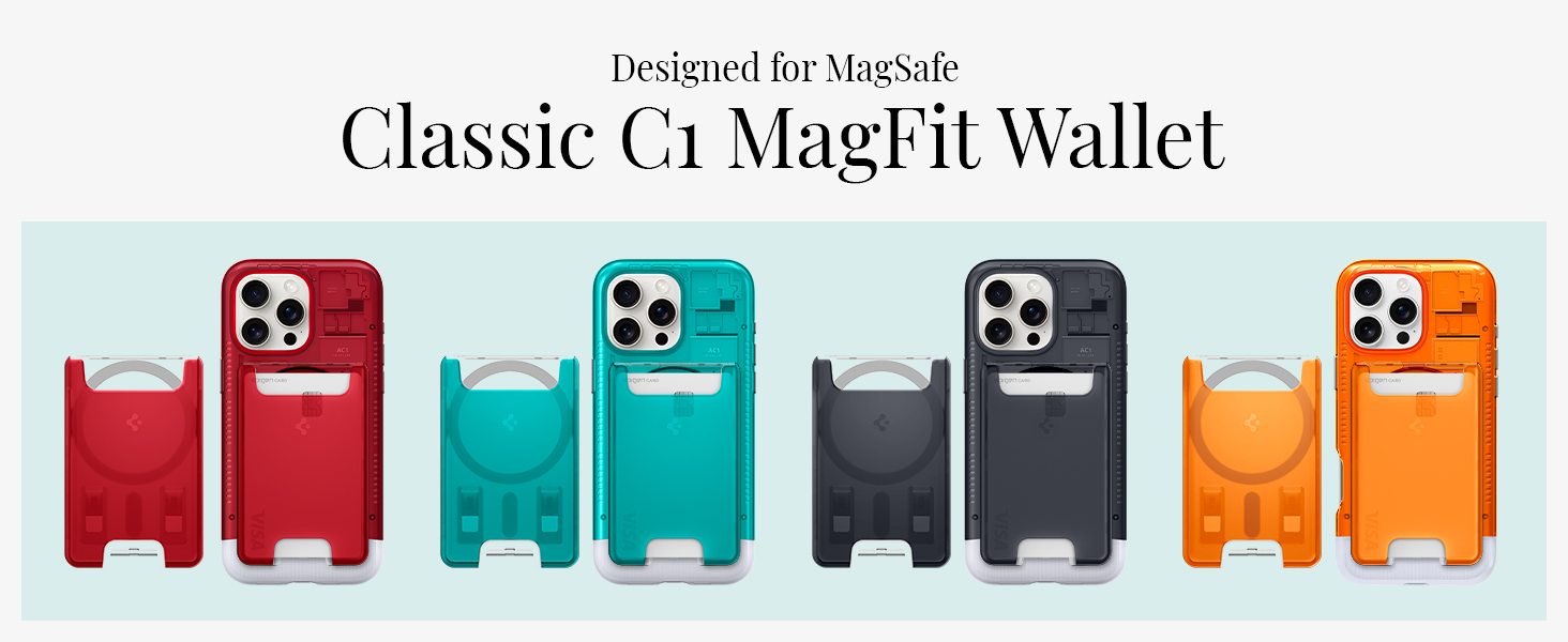 The Spigen MagSafe Wallet in Classic C1 Graphite is a slim, durable polycarbonate card holder designed for seamless magnetic attachment to iPhone 12-17 series and Pixel 9-10 series devices. It securely holds up to 4 cards or a Plaud Note device, features a retro-futuristic design inspired by the Apple iMacG3, and offers easy card access with a unique finger cutout—all while providing 360-degree protection with a matte-coated hard shell.