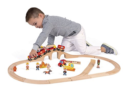 Janod Wooden Toy Fire Engine Express Train Fire Service, 33 13 accessories + 1 strip + 16 Piece Bar distance Size (Height x Width x Depth): 40 x 12 x 40 cm wooden toy made of high quality production with this wooden toy choose original fun to play. The toys comply with all EU and US, Standards and Requirements For The Safety Of Toys (88/378/EEC and 93/68/EEC Directive) in terms of materials, production and labelling. We use only safest certified non-toxic paints based on the natural components, the meet the EU safety standards (EN71) and US standards. Safety Information: Warning: To be used under the direct supervision of an adult Please note: Includes toy. Adult supervision recommended warning - not suitable for children under 36 months, small parts that could be swallowed