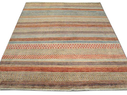 Natural dyes, hand-spun wool. This attractive Gabbeh rug has subtle, intricate geometric patterns throughout the rug. The pile, composed of high quality hand-spun wool, is soft, while the quality of the knotting ensures high durability and strength for use in high traffic areas or under furniture. Made by Afghan weavers in Northern Pakistan.