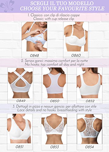 Mamma Mia Mama are: Why is the best part, as there is.Mama Mia is the line of women's Bella Maternity Pads with pre and post partum Special Products, the number one priority the convenience and practicality but not vernachlässigen the style and the desire feel Belle. Mamma Mia make it to the needs of the mother: - Maximum Quality And Safety: Fabric in soft cotton hypoallergenic and breathable made in Italy that retain its properties even after many washes. For the safety and well-being of mother and child; Attention On Their Mothers Mum is nice but be hard to, for this lady Bella make some moments, such as the breastfeeding period, which takes advantage of a bra, delivered with the simplicity of a simple gesture. Lady Bella - Italian taste and design: we believe that a nursing bra offers comfort and Prativo are as well as feminine and style can be. Because Mum A Woman Going Even Better. - Comfort: The jahrzehntelangen of experience of Lady Bella lingerie is your guarantee for fit and comfort; Or you prefer longer skirts, please choose your favorite model between the multitude of Lady Bella nursing bra lingerie Mamma Mia:- Clip-on Classic with from showcasing nursing bra cups for for those who just want more support and support: Choose PA0848 and PA0860 - - Lace breastfeeding bra with pre-formed cups without seams cups for if you would like to add a touch of elegance and style: select PA0851 and PA0853 and PA0854;Top breastfeeding period without hooks for all those who Maximum Comfort, Even During The Night: Select PA0850 and PA0852 and PA849;- All bra Mamma Mia are products with breast pads. Mamma Mia whether your style, you can choose, because a lady Bella hold dear well-being of women.