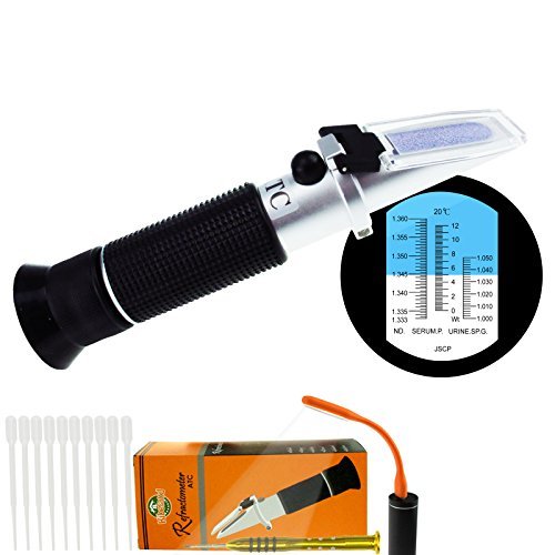 * This clinical refractometer provides veterinarians and clinicians with quick and accurate indication of vital fluid's levels. The 3-in-1 scale design measures Urine Specific Gravity (SG), Total Serum Protein (SP) and Refractive Index (RI). * The specific gravity of urine can be measured with a special hydometer so-called urinometer. Measuring by this refractometer is simplier - you need only a few drops of urine and you need not use a temperature compensation table. * ATC Compensation Range (Built-in Automatic Temperature Compensation System) from 10~30°C. * Easy and very convenient to use. Place a few drops of the liquid on the optical part of the refractometer, cover the prism (the liquid will spread more easily over the prism), look through the eyepiece against the light (focus, if necessary) and you will be able to read the result value on the scale. SPECIFICATIONS: Scale / Characteristic: Serum Protein Scale Range: 0~12g/dl Resolution: 0.2g/dl Scale / Characteristic: Urine Specific Gravity Scale Range: 1.000~1.050sg Resolution: 0.005sg Scale / Characteristic: Refractive Index Scale Range: 1.333 to 1.360 RI Resolution: 0.0005 RI Reference temperature 20°C Automatic Temperature Compensation (ATC: 10~30°C) Focus possibility Item Weight: 3.5 ounces Length: 175mm Shipping Weight: 12 ounces Shipping Dimensions: 8.3 x 3.6 x 2.2 inches PACKAGE INCLUDES: Refractometer x 1 Distilled Water x 1 Pipette x 10 Mini USB Light x 1 Screwdriver x 1 Cleaning Cloth x 1 User Manual x 1 Firm Plastic Case x 1 Paper Box x 1
