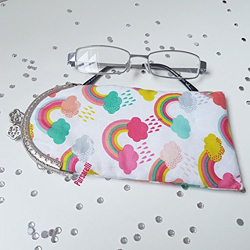 Glasses case with multi colour rainbows and clouds on a white fabric background. With a round silver style kiss lock clasp, fully lined and padded for extra coziness, and with ribbon detail inside, the frame is hand stitched to the purse for extra durability and strength. Made from cotton and a clasp, the measurements are: Width 9 cm, height 19cm (3.5 x 7.5 inches). All items by Pursarelli are handmade in the UK, in a smoke free, pet free environment. What you see is what you receive, we never put a generic photograph on and state pattern may vary.
