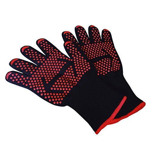 Product Features : Withstands heat up to 932°F (500°C) 2 - level heat resistant system Comfortable and flexible Maximum entrance width: 7.8 inch Large interior size and soft inner material. 5-Finger flexibility and Seamless design with non-slip silicone grip. Easy to store with hang rope design. Warning It is not permanent protection against fire or heat resistant! This product is not suitable for protection against hot liquids or hot gas! Always keep the gloves clean. A buildup or dirt can affect the gloves performance! Replace it if torn or damaged! Package Detail: 1 Pair Grilling Gloves