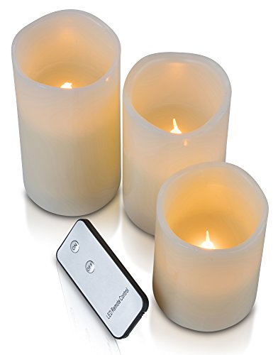 YOU'RE GOING TO LOVE THESE CANDLES... ... because they only offer real advantages over real candles: + no smoke, no soot + no open flames + worry-free, cosy candlelight + no build-up of heat + comes with remote control + no wax stains Our flameless LED candles create the same ambience as real candles without having to worry about open flames. Ideal for: decorations on the dining table, a romantic dinner, in the living room, a relaxing bath, picnics, parties, hallway lighting, night lights, dinner in the garden, at religious festivals, at work, or other places where naked flames are prohibited etc. What you get: candles in three different sizes, diameter 7.5 cm, heights: 14.5 cm, 12.5 cm and 10 cm. The real wax candles can be switched on and off with the convenient remote control. The LED inside the candle creates the kind of coy flickering light you associate with candlelight. Our satisfaction guarantee: If for some reason you do not fall in love with our candles, you will get your money back! High quality craftsmanship: the useful life of the candle needs to be seen to be believed: approx. 20,000 hours. The wireless remote control includes its battery. The 3 candles also need 3 AAA batteries each (not included). Put the set in your basket today and bring home the cosy ambience provided by LovisLeander LED real wax candles!