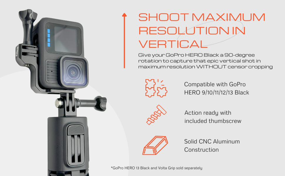 There's a number of ways to get vertically oriented videos/photos from your GoPro but this is definitely the most simple. It works with the most recent iterations of the GoPro Hero line from the Hero 9 to the most recent, the Hero 13 Black. I've tried it with the Hero 13 Black, 11 and 12 and it works like a charm with all of them. It's well made (feels like anodized aluminum) and mounts with the standard GoPro/action cam 'folding fingers'. It holds the camera securely and leaves the power button easily accessible. The type of essential accessory that does one thing and does it very well. Highly recommended!
