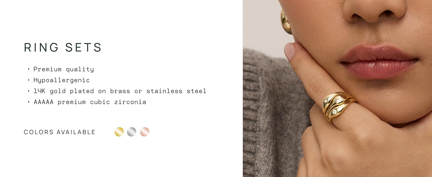 These rings are beautiful. It comes in a set of 3 so you can wear together for the look they advertised or separate. They are great quality, nice gold color and have some weight to them. I just got them so I'm not sure about tarnishing, but I've bought this pavoi brand before and never had any issues. Sizing is accurate.