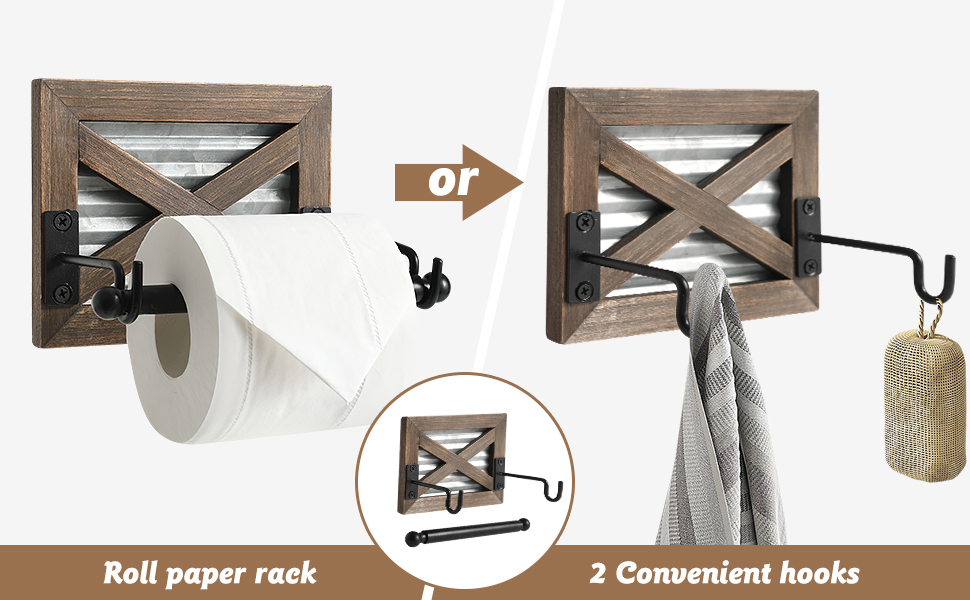 Farmhouse Toilet Paper Holder with Galvanized Metal& Black Metal - Rustic Warm Brown Wood Wall Mount Toilet Roll Holder for Bathroom Decor