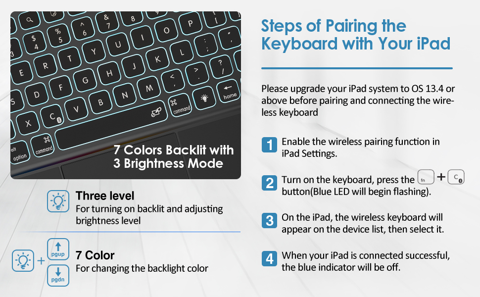 - Gesture compatible wireless track pad allows you to move the pad and keyboard back and forth without having to move your right hand to improve your work efficiency. (Please upgrade the iPad system to OS13.4 or above to connect the keyboard successfully)