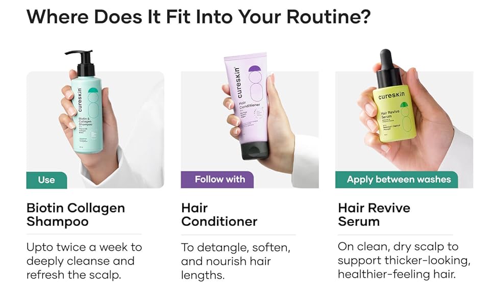 Cureskin Biotin & Collagen Vitamin B5 Glycolipids Shampoo is a 150 ml liquid formula designed to strengthen hair, reduce hairfall, and repair damage. Enriched with biotin to stimulate hair growth and hydrolyzed collagen to add volume and smoothness, it visibly increases hair density while restoring shine to dull, damaged hair. Ideal for thin, chemically treated hair, it nourishes deeply without stripping moisture.